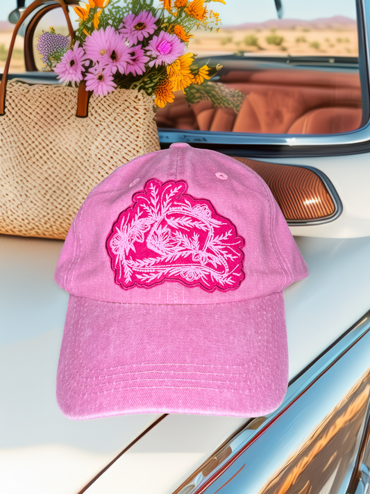 Floral Cowgirl Pink Baseball Hat – Handcrafted Embroidered Patch, Adjustable Cotton Cap – In Stock & Ready to Ship – Made in Kansas City – USA Made