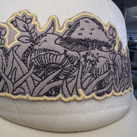 Cream Trucker Hat with Pyrex Forest Fancies Mushroom Patch – Handmade in Kansas City, Ready to Ship
