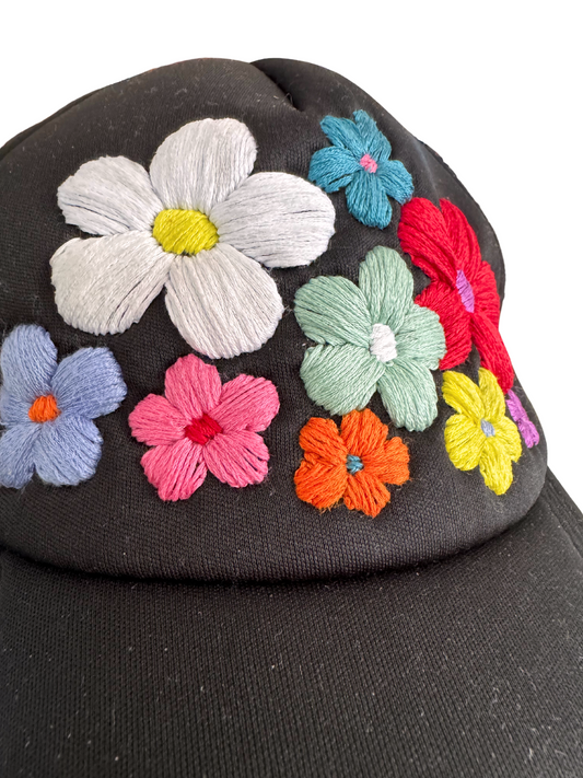 Black Floral Trucker Hat β Hand-Embroidered Colorful Flowers, Ready to Ship, Made in Kansas City