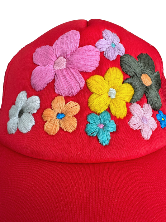 Red Floral Hat β Hand-Embroidered Colorful Flower Design, Ready to Ship, Made in Kansas City