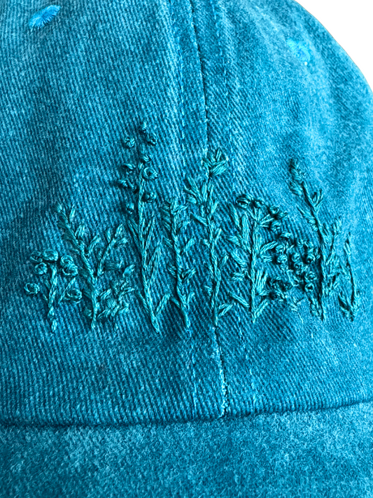 Teal Monochrome Floral Hat β Hand-Embroidered Wildflower Design, Ready to Ship, Made in Kansas City