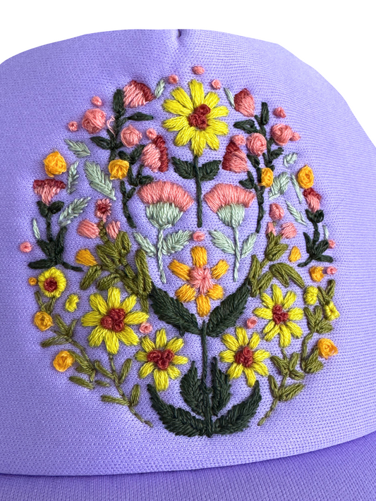Lavender Floral Hat β Hand-Embroidered Blooming Garden Design, Ready to Ship, Made in Kansas City