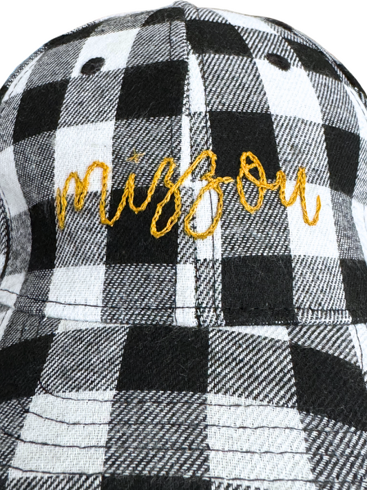 University of Missouri Tigers Plaid Hat β Black and White Plaid with Hand-Embroidered "Mizzou," Ready to Ship