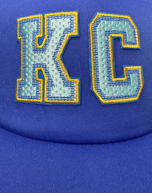 Royal Blue KC Trucker Hat with Light Blue & Gold Embroidered Patch β Handmade in Kansas City, Ready to Ship