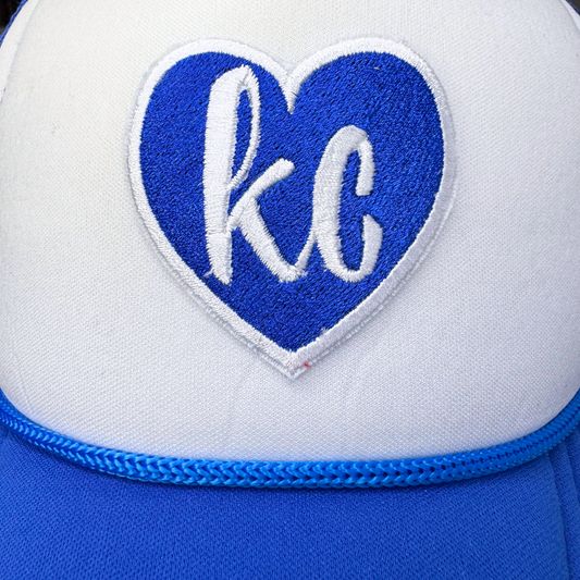 Royal Blue KC Heart Trucker Hat β Embroidered Patch in Kansas City Royals Colors β Handmade in KC, Ready to Ship