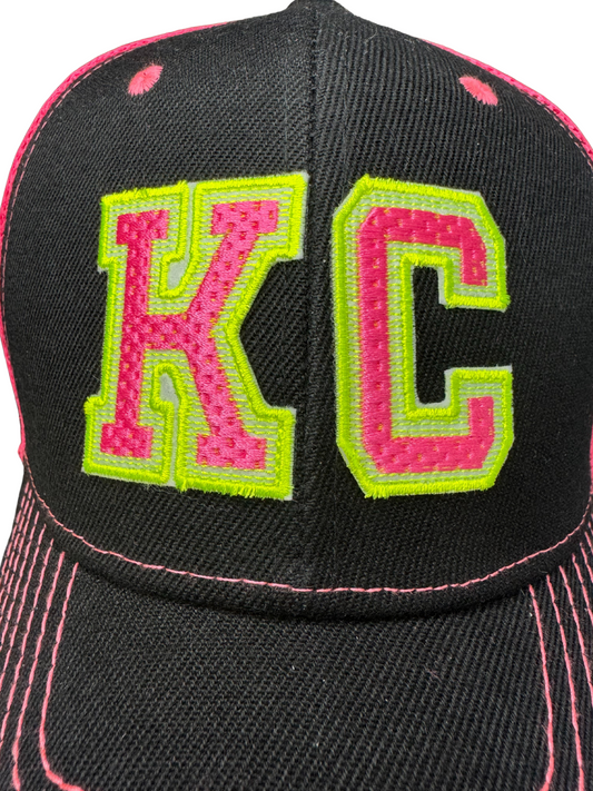 Neon Pink & Neon Yellow KC Trucker Hat β Embroidered Patch on Black Hat β Handmade in Kansas City, Ready to Ship