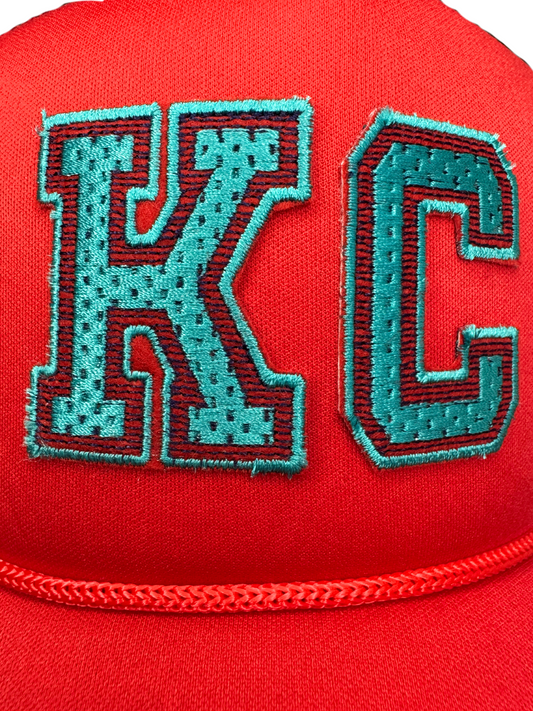 Red Trucker Hat with Teal KC Patch β Kansas City Current Colors β Handmade in Kansas City, Ready to Ship