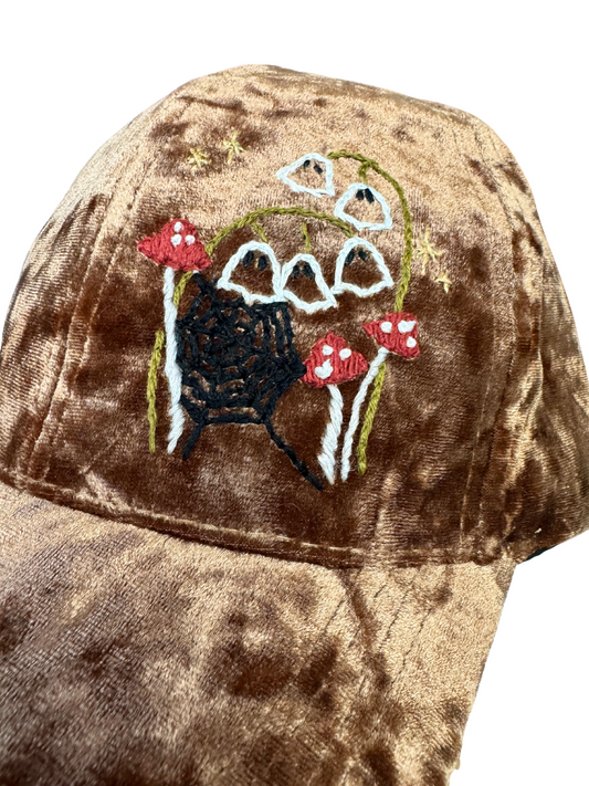 Brown Velvet Hat β Hand-Embroidered Mushroom and Spider Web Design, Ready to Ship, Made in Kansas City