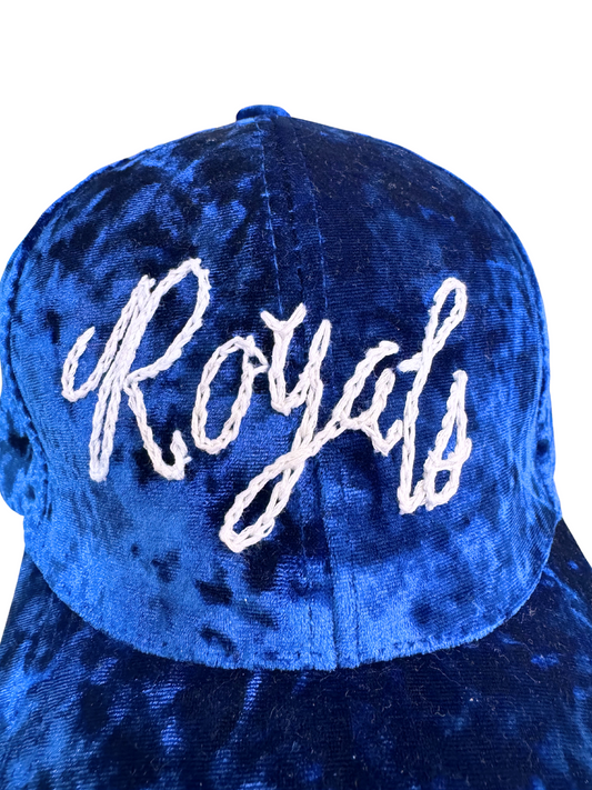 Hand Embroidered Royals Hat β Crushed Velvet Blue Cap Handmade in Kansas City