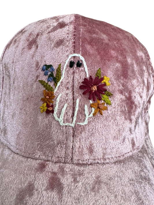 Pink Velvet Ghost Hat β Hand-Embroidered Floral Ghost Design, Ready to Ship, Made in Kansas City