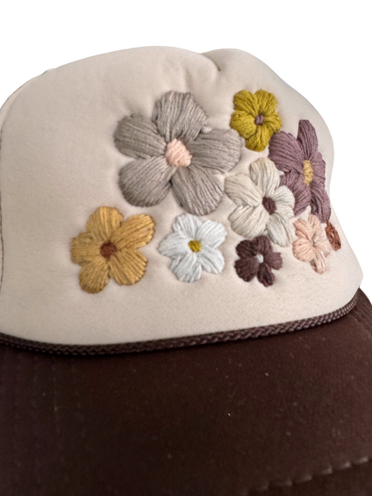 Brown and Beige Floral Trucker Hat β Hand-Embroidered Neutral Flowers, Ready to Ship, Made in Kansas City