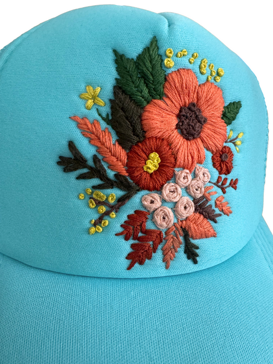 Turquoise Floral Bouquet Hat β Hand-Embroidered Flower Design, Ready to Ship, Made in Kansas City