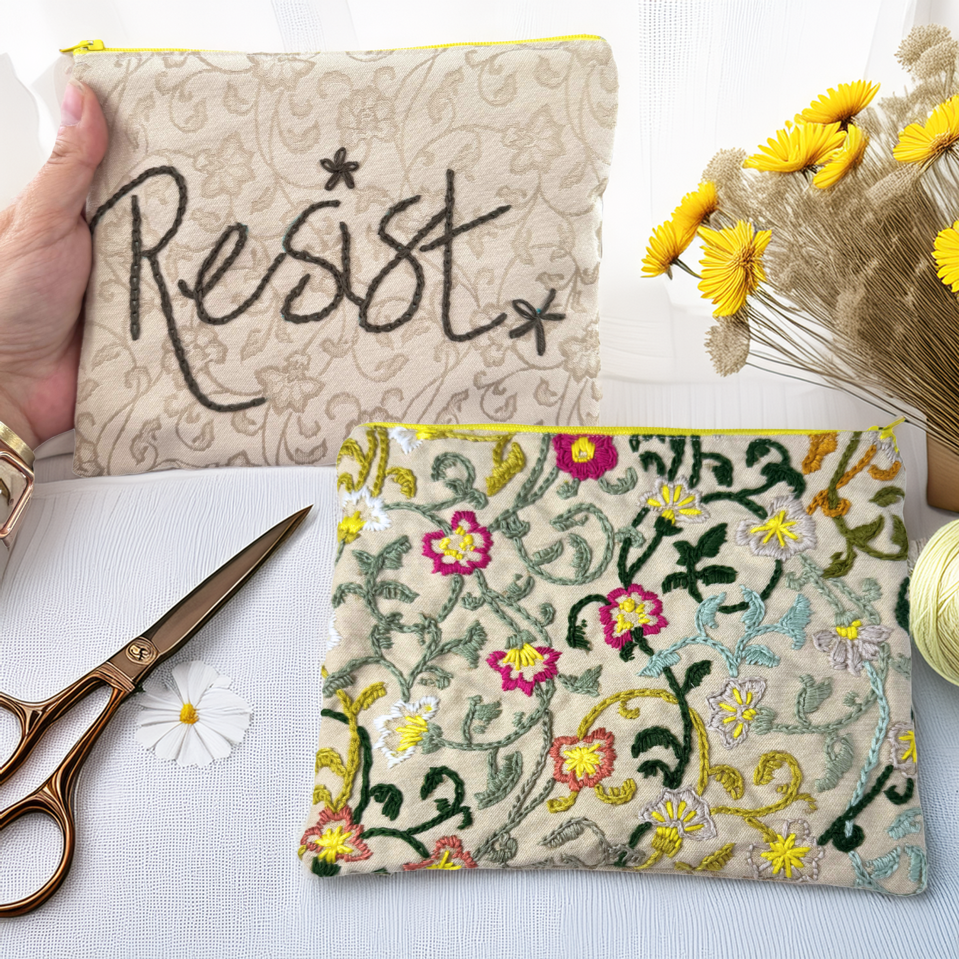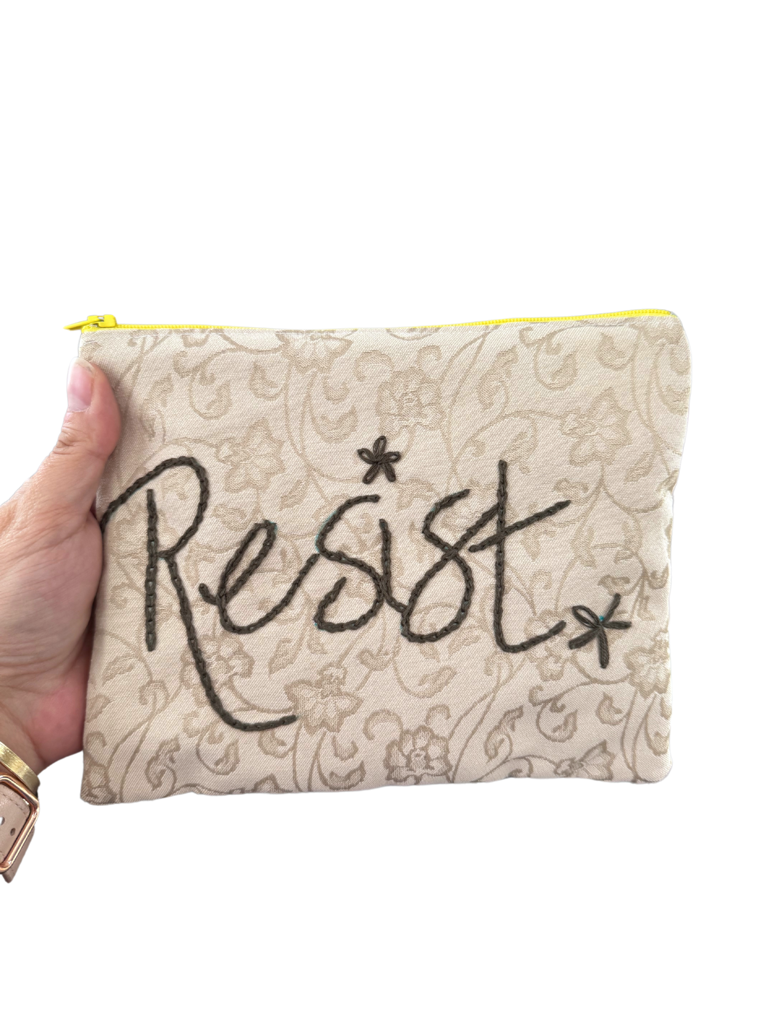 This one-of-a-kind embroidered zipper clutch is a wearable piece of protest art. One side features lush, hand-stitched florals in vibrant shades of pink, yellow, moss green, and pale blue, layered over a textured ivory background. The reverse side boldly reads “Resist” in hand-embroidered script, blending modern activism with heirloom craft. Inside, a contrasting dark floral cotton lining adds a bold surprise pop. Roomy enough for essentials like your phone, keys, wallet, and small personal items, this clutch is a showstopper in both style and sentiment.